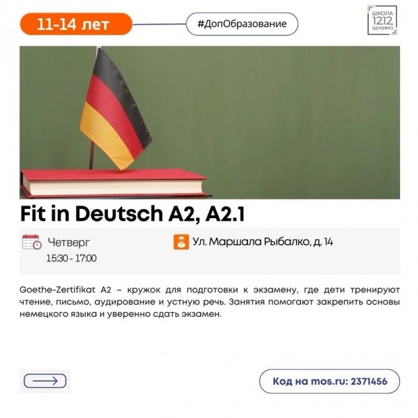Кружок для подготовки к экзамену Goethe - Zertifikat по уровню А2, где дети транслируют чтение, письмо, аудирование и устную речь. Занятия помогают закрепить основы немецкого языка и уверенно сдать экзамен.