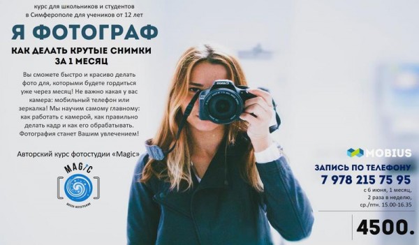 Это авторский курс от фотостудии "Magic", после которого Вы сможете делать классные снимки даже на мобильный телефон, будет знать как работать с любой камерой, поймете что такое композиция и как обрабатывать снимки.